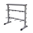 Dette dumbbell vektstativet er designet for å holde frie vekter, manualer og vektstenger organisert og opp fra gulvet. Den passer til de fleste størrelser og stiler, inkludert neopren og støpejern. Den stabile rammen og de to hyllene vil hjelpe deg å opprettholde et renere hjemegym miljø ved å tilby et sted å parkere vektene når de ikke brukes. Den er laget av kraftig stål for mange års bruk. Gummi motskli basen bidrar til å beskytte gulvet fra skader og gir stabilitet og optimal sikkerhet. Dette stativet med sin robuste konstruksjon har en maks belastning på 300 kg. Det er også egnet for nesten alle lengder av vektstang. Den måler 49 x 100 x 95 cm når ferdig montert.