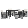 Dette 5-delte hagemøbelsettet er et supert tillegg til utendørsområdene dine, som kombinerer funksjon med en moderne vibe for en stilfull middag. Det inkluderer et stilig firkantet bord i svart og kremhvitt sammen med fire komfortable stoler. Alle bitene er laget for å takle utendørselementene, s...