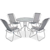 Skap et overbevisende og helhetlig utrykk i uteområdet med denne hagespisestuen. Denne utendørs spisestuen har en pulverlakkert stålramme som gjør bordet og stolene stabile og holdbare. Den glatte glassbordplaten er lett å rengjøre med en fuktig klut og perfekt for å holde mat, drikker og andre p...